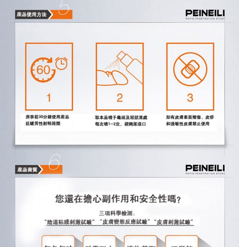 【使用方法】:房事前15分鐘使用本品噴於龜頭和冠狀溝部位,塗抹均勻即可,本品有效時間60分鐘。